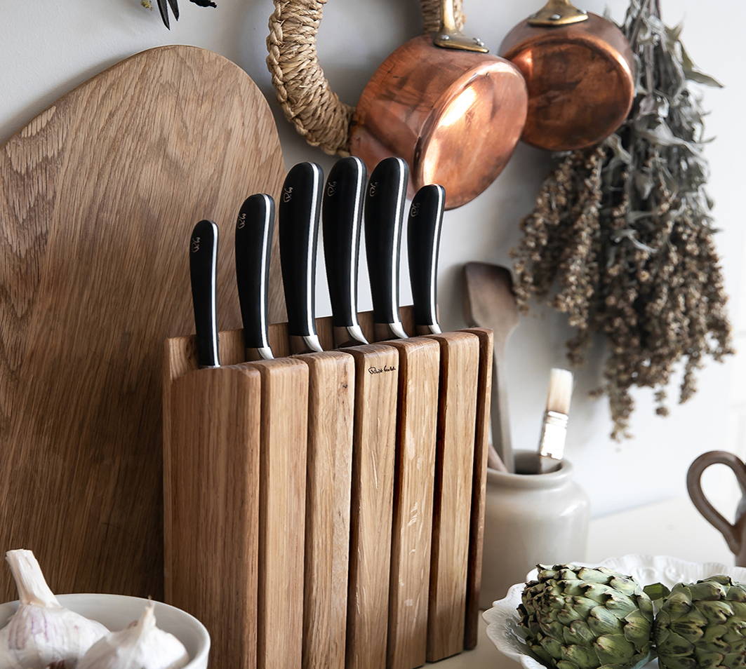 Made from durable, solid oak on stable silicone feet and designed to hold six kitchen knives, the block has been designed to safely store your kitchen knives with the blade to the front, so they are the right way round to reach for, remove and use.