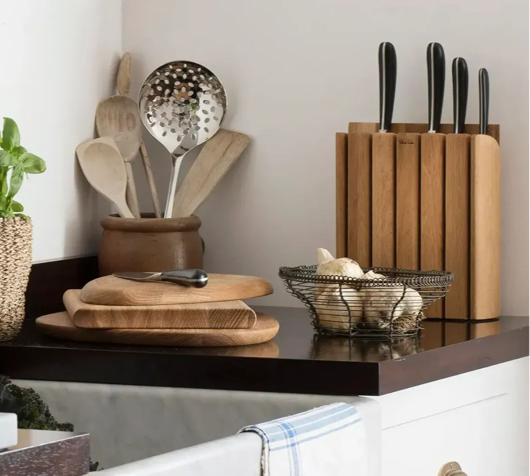 Enhance your kitchen knife storage with our knife block set, an effective space-saving solution, with a complementary gift of a hand-held knife sharpener.