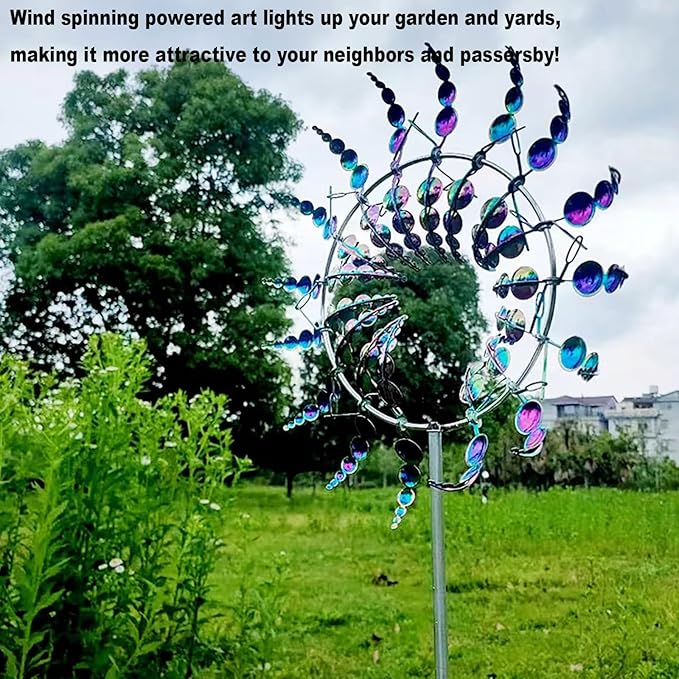 Our kinetic metal wind spinner features a multi-color brushed coating and bottom stabilizing stakes to withstand all kinds of weather, sturdy and durable for use on windy days. Our solar wind spinner features a sturdy metal structure with dual wind motion.