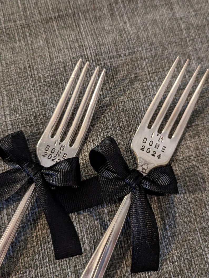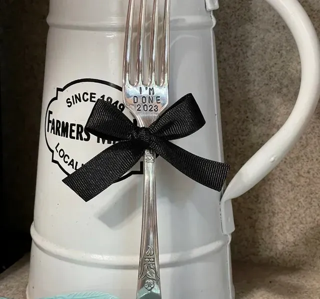 🎉🎓Stick a fork in me, "I'm Done"! This whimsical, fun, hand stamped fork makes the perfect gift for a retirement, graduation or so much more!